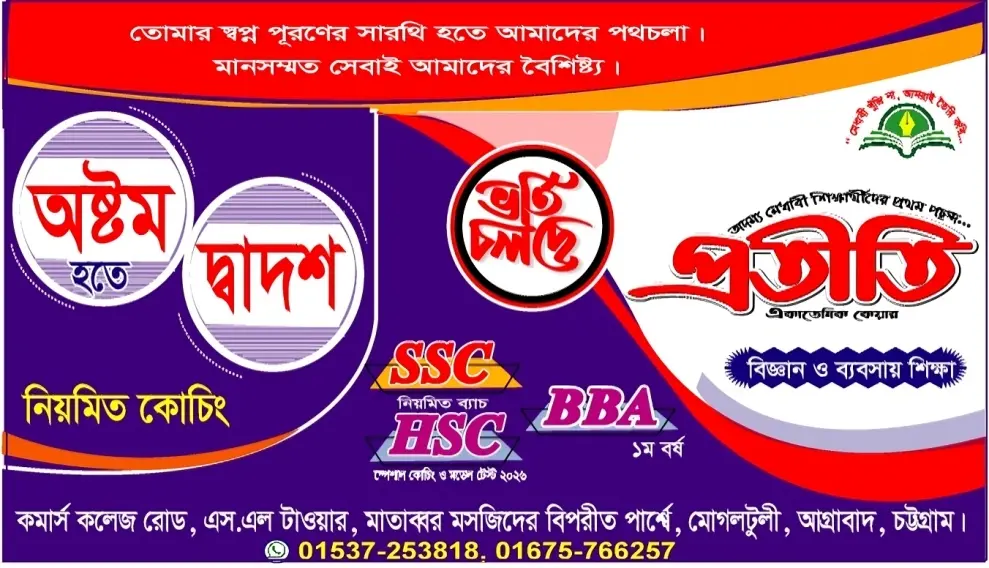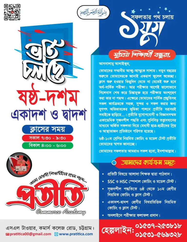 আসসালামু আলাইকুম ওয়া রাহমাতুল্লাহ, শিক্ষাই জাতির মেরুদন্ড। শিক্ষা ছাড়া কোন জাতি উন্নতির শিখরে আরোহন করতে পারে না। শিক্ষা প্রতিষ্ঠানসমূহ আনুষ্ঠানিকভাবে শিক্ষা প্রদানের মাধ্যমে শিক্ষার্থীদের জ্ঞান অর্জনের পথ উন্মুক্ত করে দেয়। ঐতিহ্যবাহী প্রতীতি কমার্স একাডেমীর কোমলমতি শিক্ষার্থীরা অত্যন্ত সৌভাগ্যবান। কারণ তাদের বিকশিত প্রতিভা সমৃদ্ধ করার জন্য নানামুখী কর্মকান্ড পরিচালিত হয়….বিস্তারিত